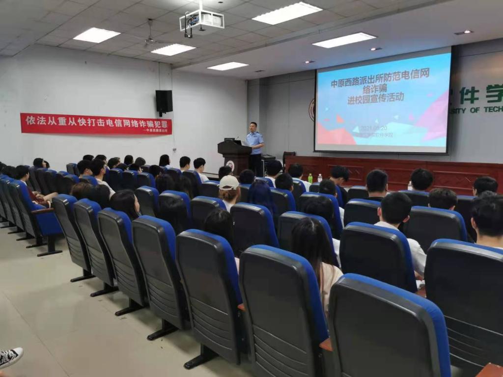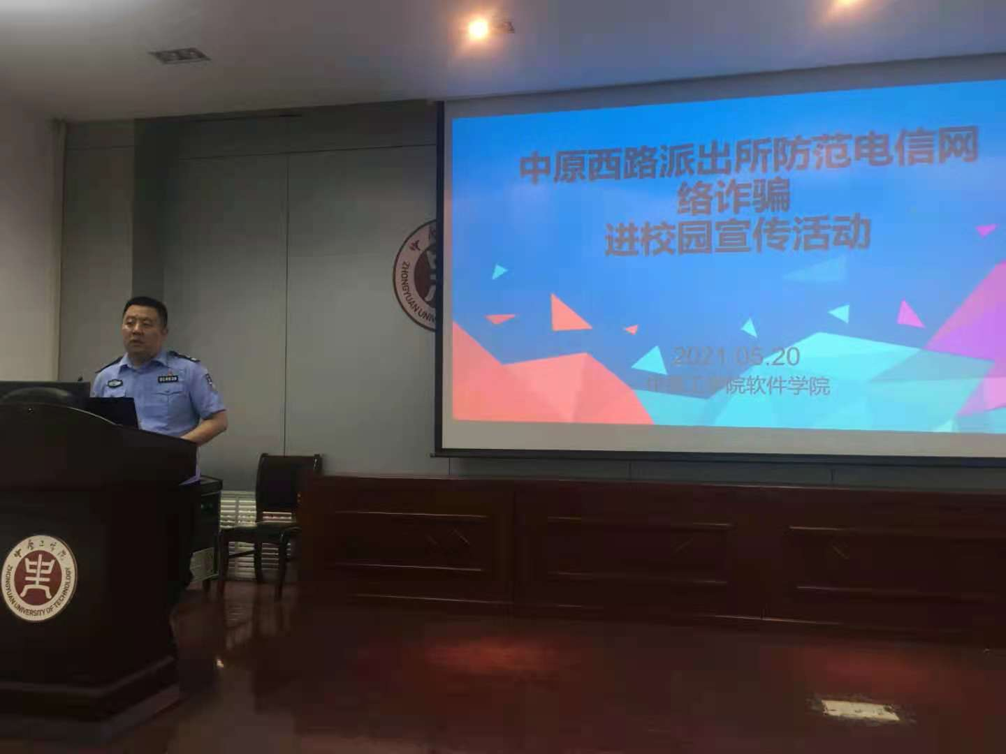 为了让在校学生进一步了解电信网络诈骗,增强我院大学生电信网络诈骗的防范意识,并学会如何预防电信网络诈骗,2021年5月20日下午,中原西路派出所负责社区的张健所长一行来到太阳成集团tyc33455,为在校师生带来“防范电信网络诈骗进校园”宣传活动,共有150人参加会议。