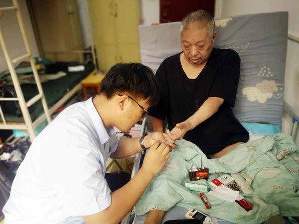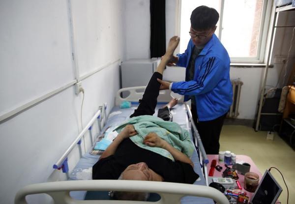 待父亲吃完饭后,家宝便走到床前,为父亲按摩。从脚趾头到双腿,一遍遍重复着一样的动作,不耐其烦。