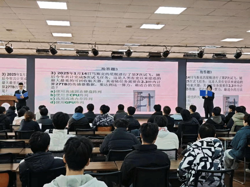 活动伊始,主持人清晰宣读完比赛规则,决赛正式拉开帷幕。开场首先进行5道观众抢答题,题型轻松有趣,迅速点燃了现场气氛,答对的观众获得了精美小礼品。随后进入班级代表队比拼环节:10支队伍首先通过必答题紧张对决,产生8强;再经一轮必答题筛选,决出6支晋级队伍。紧接着的“6进3”风险题环节,选手依据当前成绩选择题目,并可向亲友团求助,答对加分、答错扣分的赛制使得竞争悬念迭起。此后还设置了观众互助答题环节,由观众抢答并为指定队伍加分,进一步拉近了赛场与观众的距离。