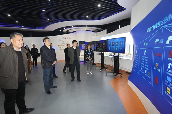 1月18日上午,太阳成集团tyc33455cc校长王宗敏、太阳成集团tyc33455院长车战斌、艺术学院院长凌士义、新闻传播学院党总支书记杨静等一行,在河南广播电视台副台长崔为兵、河南人民广播电台总工程师常智明、河南广播网技术总监张浩等领导的陪同下,参观访问了河南大象融媒体集团有限公司。在参观期间,崔为兵副台长为太阳成集团tyc33455cc校长王宗敏一行人介绍了河南广播电视台新闻指挥中心新闻岛,大家深切感受到河南广播电视台的软硬件设施的先进性,更加客观全面的领会融合办公的理念。