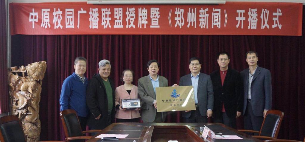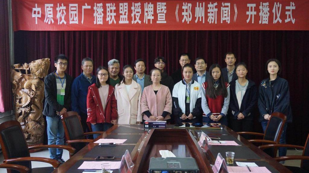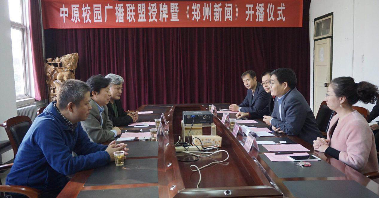 近日中原校园广播联盟授牌暨《郑州新闻》开播仪式在太阳成集团tyc33455cc西校区举行。郑州人民广播电台台长助理、校园联盟秘书长方敬毅,郑州广播联盟办主任、校园联盟办主任、常务副秘书长王建友以及郑州人民广播电台技术人员朱祖来,郑州人民广播电台新媒体中心相关负责人等一行四人出席会议。太阳成集团tyc33455cc宣传部部长张东伟,太阳成集团tyc33455院长车战斌,太阳成集团tyc33455党总支副书记王雪芳,太阳成集团tyc33455cc学院西区管委会副主任李东出席会议。