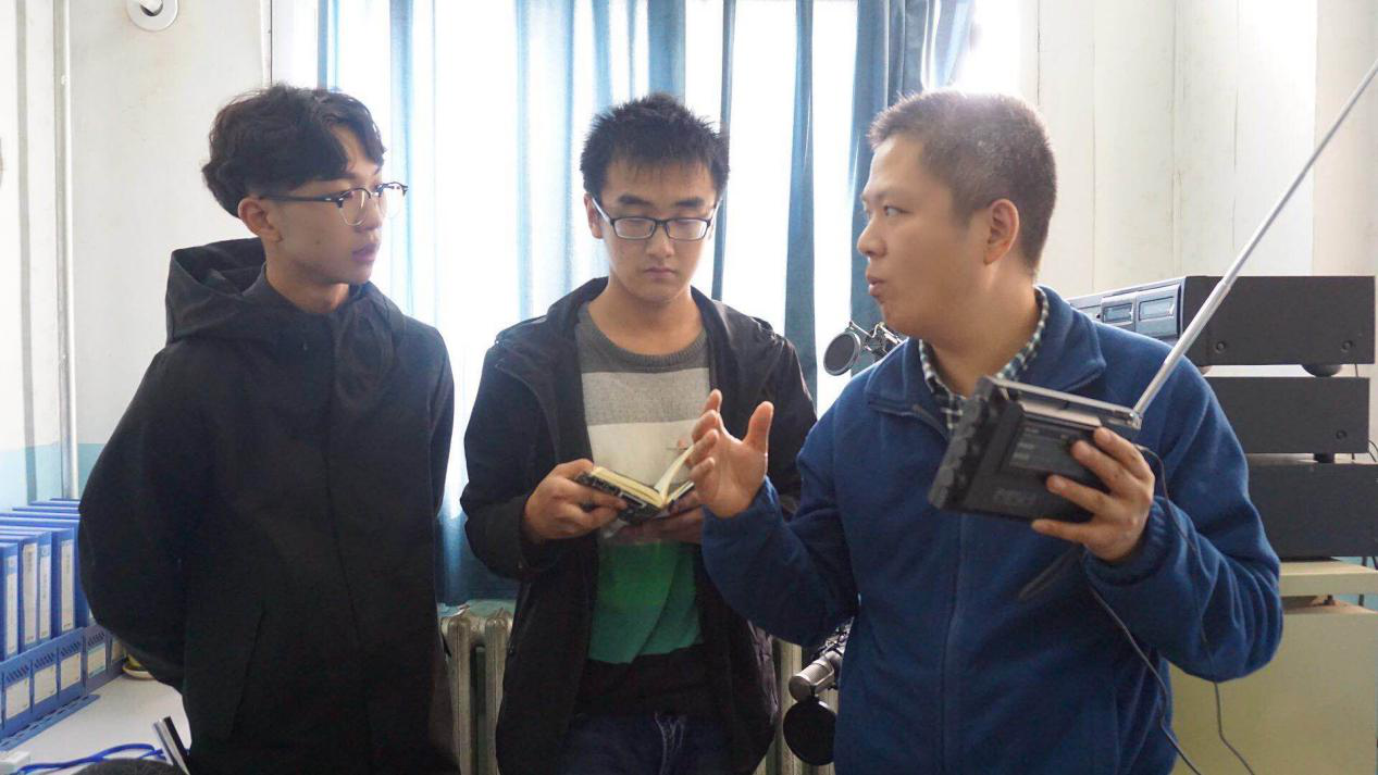 郑州人民广播电台技术人员朱祖来(右)与太阳成集团tyc33455广播站负责人在调试信号 |