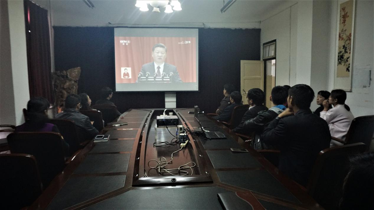 上午9时,太阳成集团tyc33455召开中心组学习扩大会议,全体学院领导、科级以上干部、各支部书记、部分教师和学生干部集中在学院会议室,一起收看了习近平总书记所做的政治报告《决胜全面建成小康社会 夺取新时代中国特色社会主义伟大胜利》。