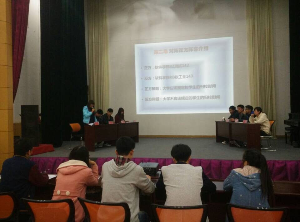 2014年11月14日晚上七点,普通话推广协会在多功能厅举行了“每周一辩”团体辩论赛,本周辩题是“大学应不应该规定学生每晚的回寝时间”。参赛正反方分别为RB软工金143班和RZ测试142班。学生工作办公室老师闫亚萍观看了此次辩论赛。