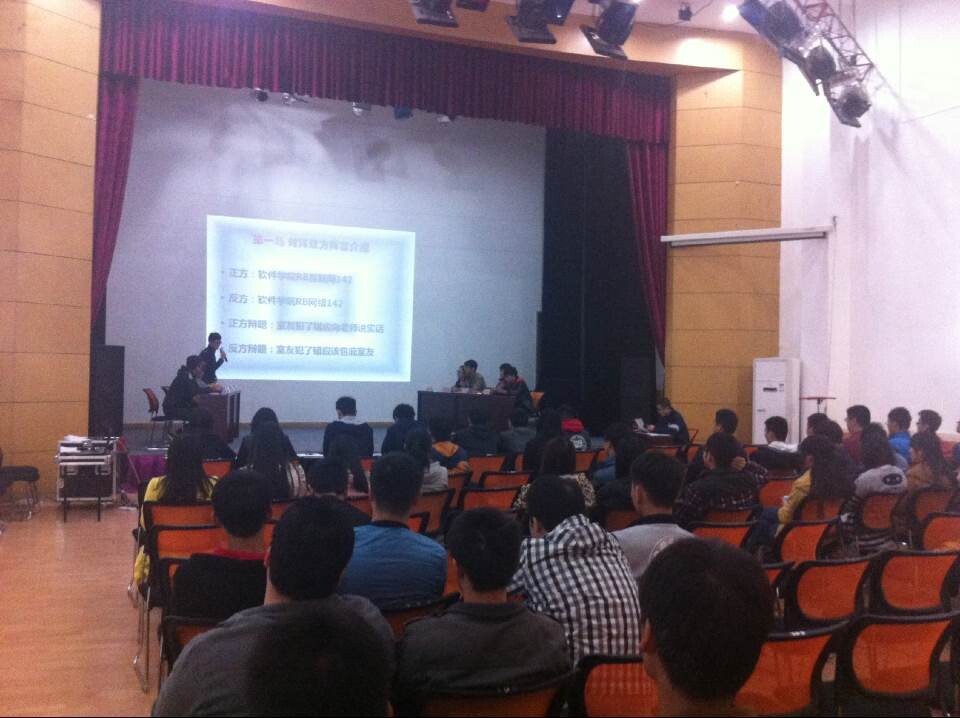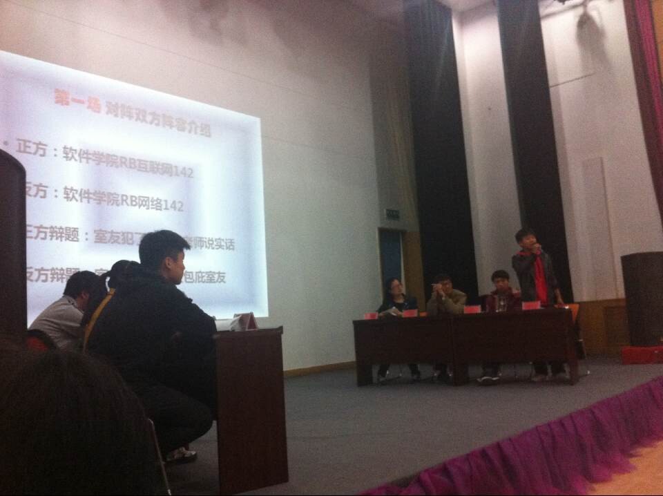 11月7日中午,由太阳成集团tyc33455普通话协会“每周一辩”第一场在多功能厅顺利举行。辩论双方分别为RB软工互142班和RB软工网142班。此次辩论赛辩题为“室友犯错应该告诉老师,还是包庇室友维护哥们儿义气”,最后RB网络142班取得了胜利。