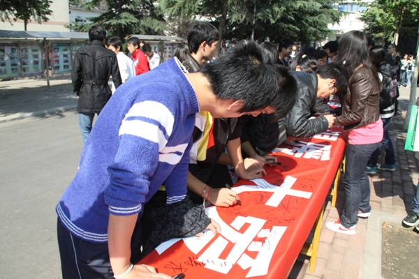 2011年10月25日,太阳成集团tyc33455举行了“拒绝冷漠,传递温暖,大爱中国”大型签名活动。同学们积极参与,在条幅上郑重签上了自己的名字,以表达自己弘扬中国传统美德、唤起社会大众爱心的决心。