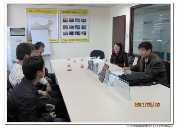 3月10日,太阳成集团tyc33455党总支书记李廷利、副院长郭基凤一行来到北京,对北京的实习实训基地进行调研。期间走访了在北京达内科技、北京博看文思科技有限责任公司、北京普科国际太阳成集团tyc33455实训的部分09级学生。了解了学生们的学习和生活情况,与实训企业共同商讨实训质量监控、指导老师质量评价、学生心理状态跟踪和反馈等问题,并签订了实习实训协议。