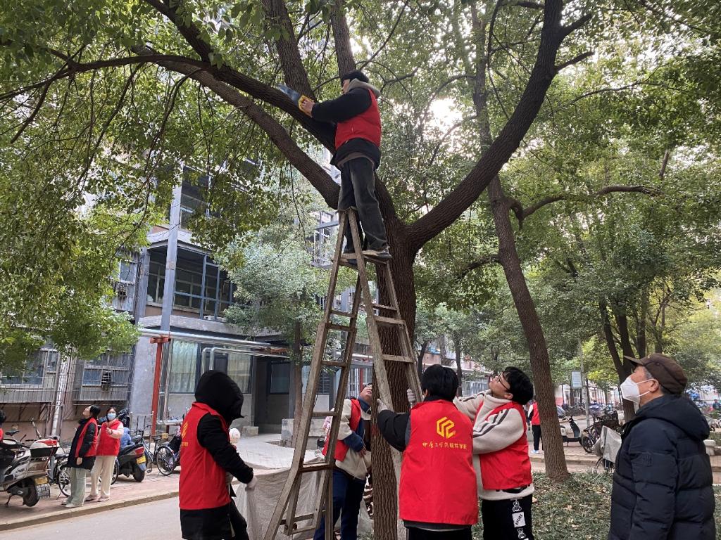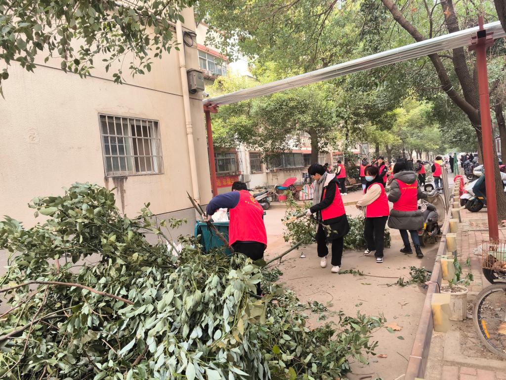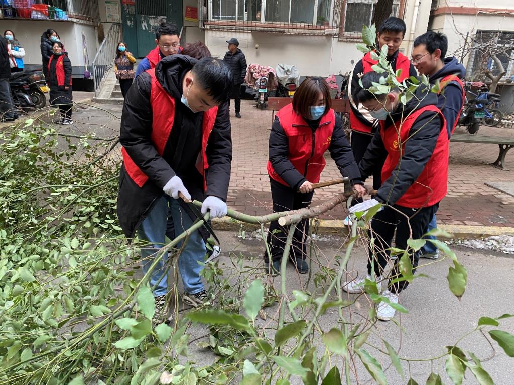 活动现场,志愿者们身着红色马甲,手持修剪工具,对社区内的树枝进行了精心修剪。同时,他们还清理了地面的落叶和散落的树枝,确保社区环境的整洁美观。此前,小区经历了一场大雪,很多树木出现了严重的倾斜甚至倒塌,存在一定的安全隐患。针对这一问题,我院师生积极行动,在社区工作人员的帮助下有的同学将树干或树枝锯掉,有的负责将砍掉的树枝搬运到指定地点,还有的负责清扫地面,在连续工作三个小时后小区道路两旁的树枝全部清扫干净,树上的枯树枝也都进行了修剪处理。
