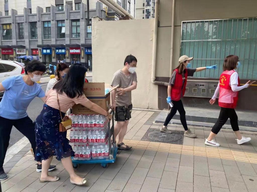 接着,在工作人员的指引下几位老师用手推车将矿泉水、医用口罩、酒精、消毒湿巾等防疫物资依次送往各个志愿点和社区服务站,竭力为社区疫情防控提供应急支撑和保障服务。教工党员下沉结对社区的同时,还协助社区进行防疫宣传、维护秩序、扫码登记、搬运物资等工作,确保社区各项工作平稳有序开展。