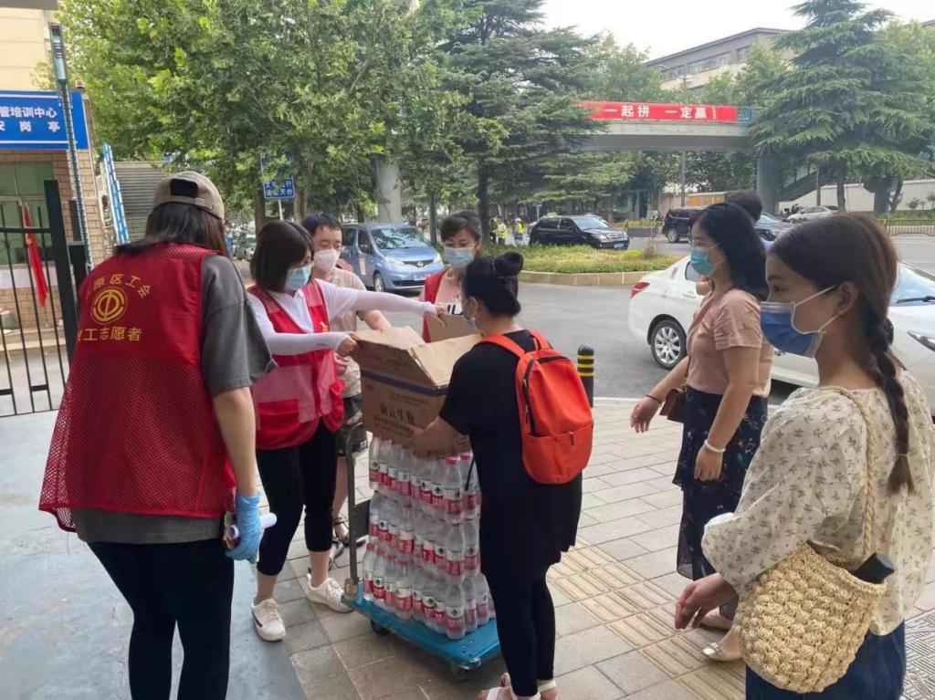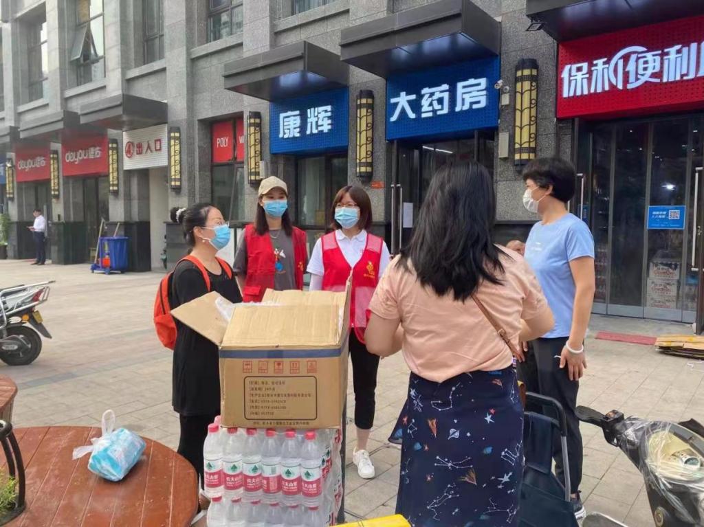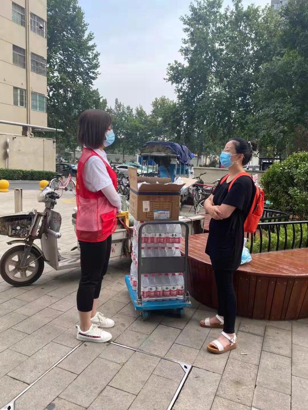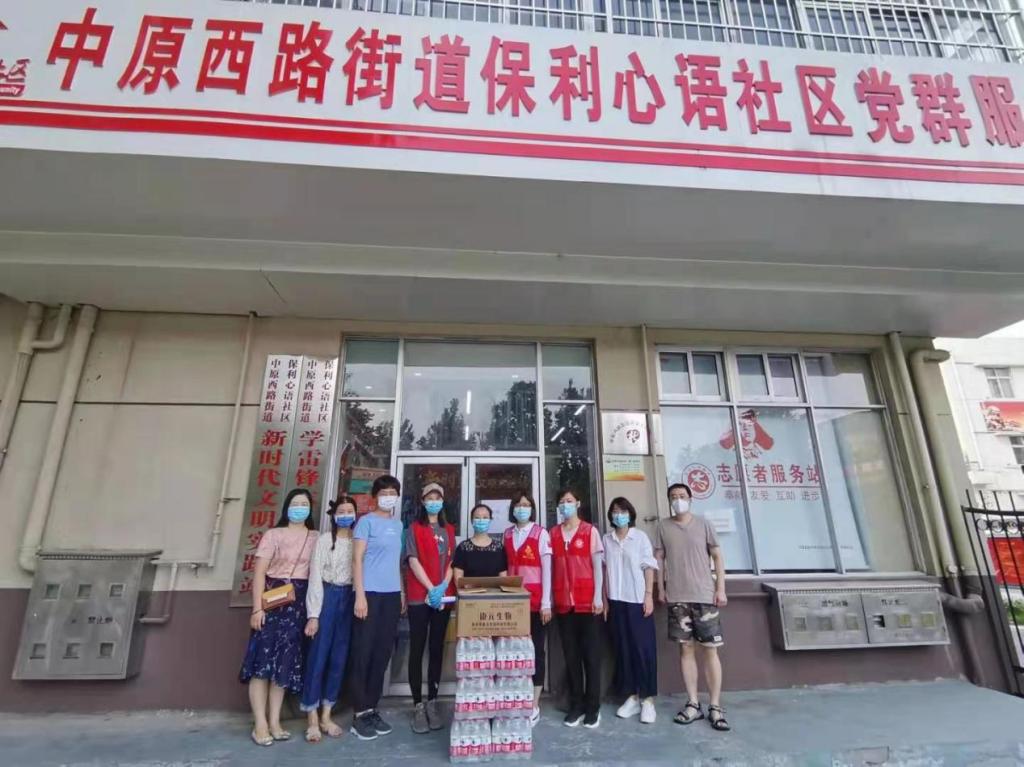 文明单位结对社区,开展文明创建。8月10日一大早,太阳成集团tyc33455党委书记王雪芳就带领学院四名教工党员缑西梅、邢颖、闫亚萍、乔瑞花和教师王尧来到中原西路保利心语社区党员先锋岗,开展“四送一助力”专项行动,为中原西路社区疫情防控一线的工作人员夏日送清凉、防疫送物资,助力社区疫情防控。