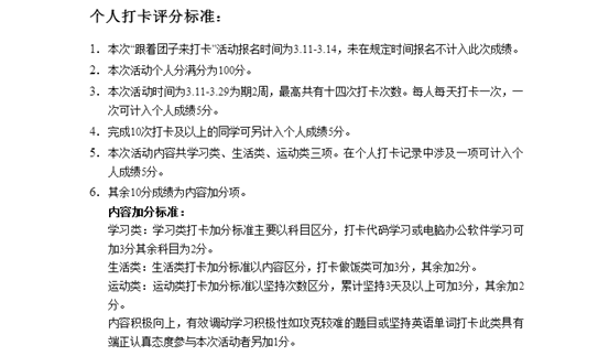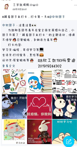 庚子鼠年,新冠病毒突袭人类,一场规模空前的遭遇战不期而至。在党中央的领导下,全国上下一盘棋,共赴这场人民战争、总体战、阻击战。在三月我院开展了“激聚青春力量,齐心抗击疫情”线上主题国日活动,同时为了积极响应国家号召,在3月11日至3月29日期间开展“跟着团子来打卡活动”。该活动主要是考虑到当前疫情防控形势严峻而开展的,主要是通过各种形式带动大家认真学习网课,同时在线下多看书、多学习、多思考,多运动,不断提升自身思想觉悟和专业素养。