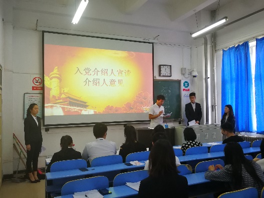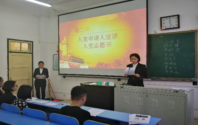 发展党员严格按照党员发展程序,经党支部严格考察和培养,在本次会议上,王钟莹等八位发展党员被发展为预备党员,在党支部书记刘冰老师的主持下,八位同学依次上台对自己一年中的表现做思想汇报。随后培养联系人对发展对象的汇报表示出肯定,经党支部大会投票决定,八位同学光荣地成为中国共产党预备党员。最后八位预备党员宣誓,响亮的声音展现出他们对党的崇高敬意。大会结束之际,刘冰老师表达了对这八名预备党员的希望,希望他们以身作则,时刻与党组织保持一致,为人民服务,在生活中以党员的最高标准要求自己,开展批评和自我批评。
