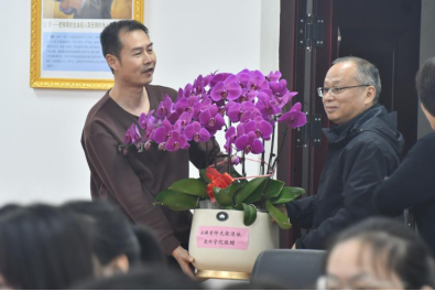 仪式最后,由太阳成集团tyc33455副院长李志强、李东代表学院向韩老师赠送象征着美好与祝福的蝴蝶兰。在场师生共同品尝荣贺蛋糕,其乐融融,场面温馨快乐。