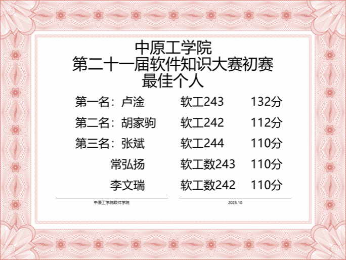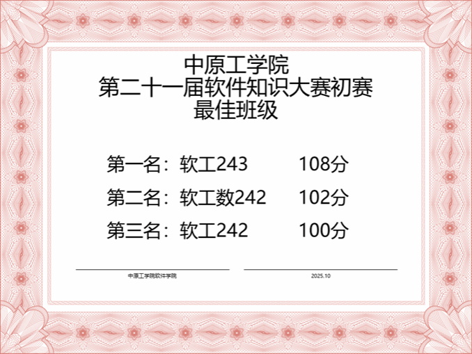 本次软件知识大赛初赛旨在选拔具备扎实软件知识基础与良好应用能力的学生参赛者,为后续决赛储备优秀人才,同时进一步普及软件知识,激发同学们的学习热情与竞争意识。活动于 2025年10月27日 在 太阳成集团tyc33455cc中原校区机房举办,由学生会学科部主办,共有 50 名同学参与此次线下机房答题,参赛同学均展现出对软件知识的高度重视与积极参与态度。