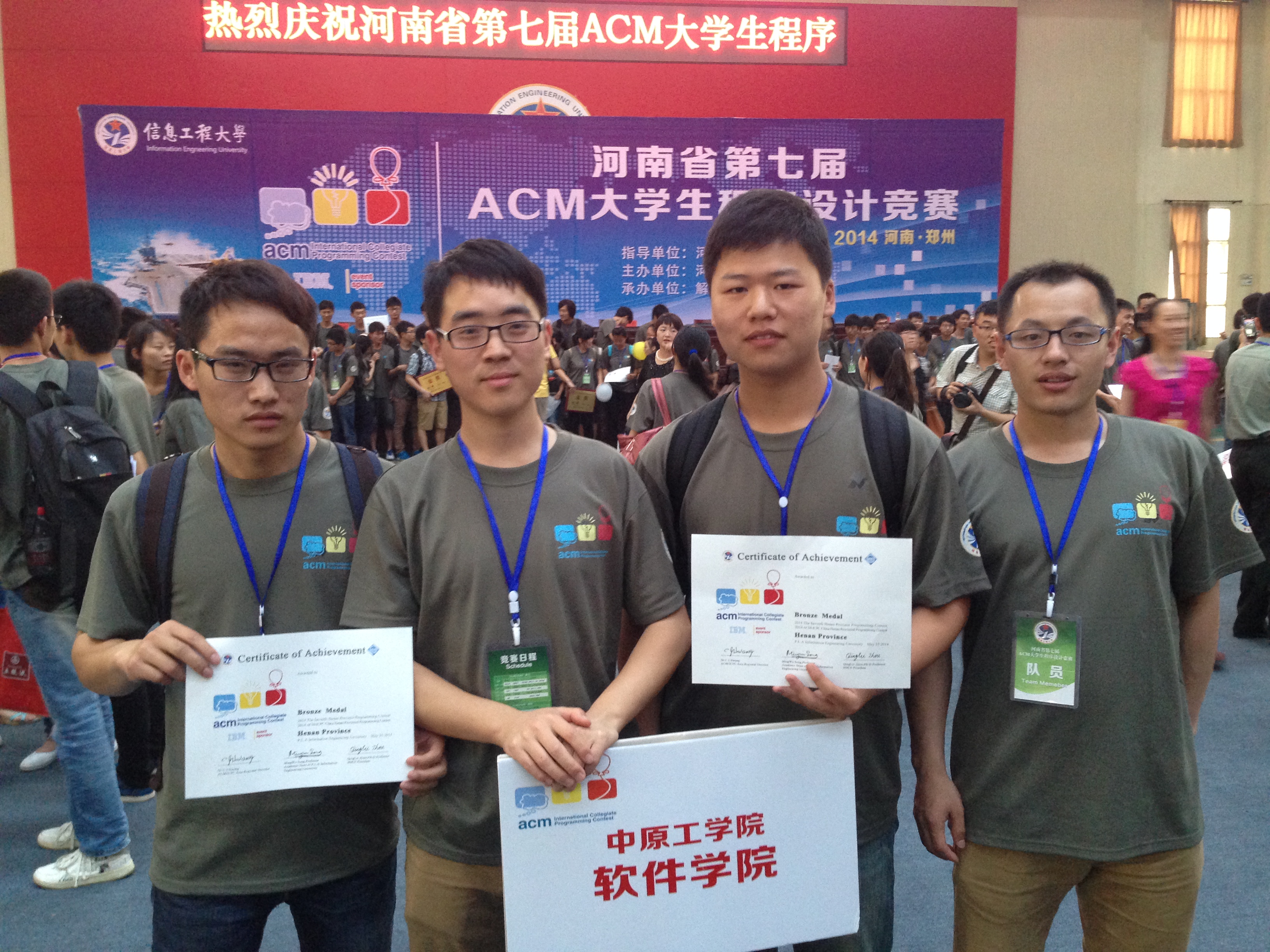 2014年5月24日至25日,河南省第七届ACM大学生程序设计竞赛在解放军信息工程大学举行,此次比赛参赛规模再创新高,共有173个队伍500多名同学参赛。此次竞赛我院共派出3个代表队,其中由李青江、吴山岗、杜克强组成中工软件一队和李文亮、郑斌、崔文娟组成中工软件二队获得2枚铜奖,此成绩刷新了太阳成集团tyc33455的在该项赛事中完全由我院学生独立组队获得的最好成绩。
