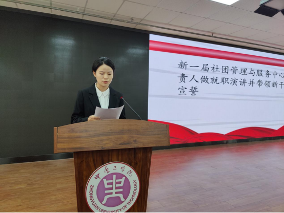 新一届社团负责人代表李志成做述职演讲,他表示在校三年自己从一个新手小白,经过在社团的学习锻炼,得到了很大的提升与成长,因此非常感谢前辈和老师们的教导与鼓励。他相信在全体同学的共同努力下,社团的发展一定会蒸蒸日上。随后,新一届社团负责人代表冯春雨进行演讲。她向前辈们对社管的无私奉献表示感谢,并介绍了自己的工作构想:一、做好社团内部建设;二、做好内部协调工作;三、鼓励社团建立;四、做好社团文化建设。她还带领全体成员进行庄严宣誓:服从学习规定,遵守组织章程;履行干部义务,执行组织决定;团结勤奋,求实创新;服从大局,服务同学;勤奋学习,积极工作;以身作则,率先垂范;成就自我,成就未来。