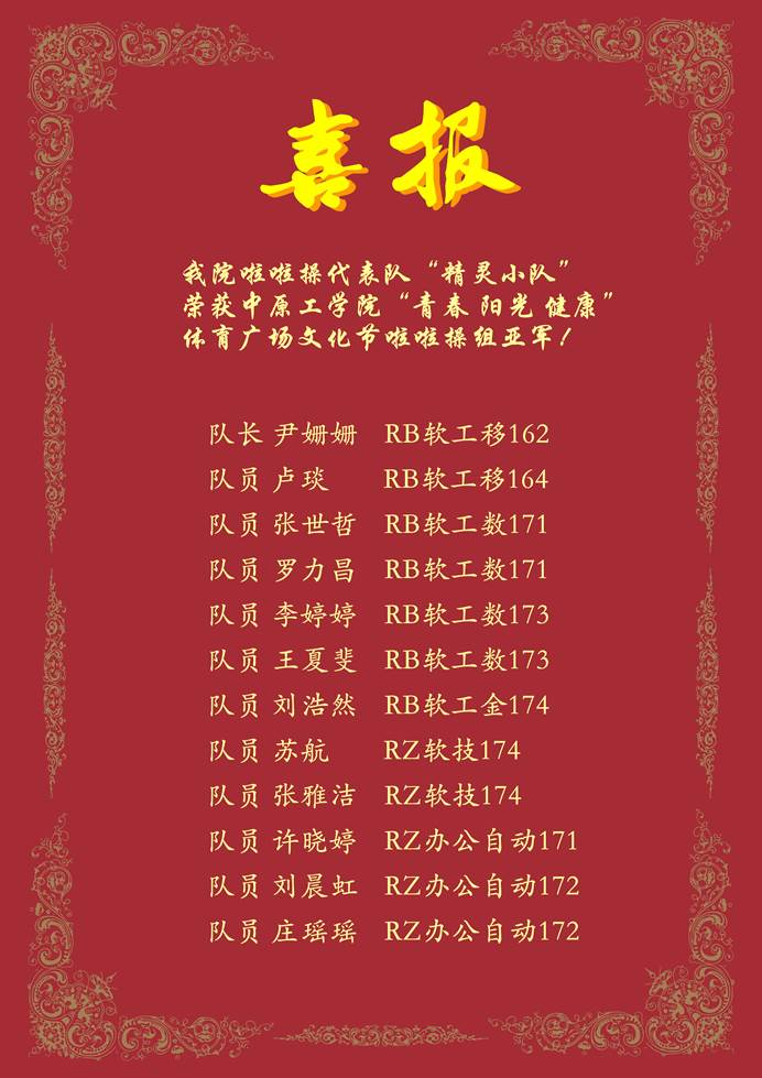 最终,我院啦啦操代表队荣获啦啦操组第二名的好成绩,让我们为她们鼓掌喝彩吧!流血流汗几人知,只为软院谱新篇。他(她)们的坚持不懈、笑对万难值得我们所有人尊重和学习。