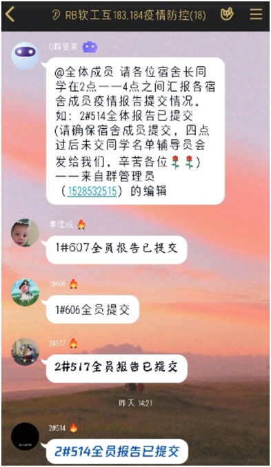 RB软工互183、184班第一时间组建班级疫情防控汇报群,由寝室长每天按时汇报各寝室人员的健康状况,如有发热等现象第一时间告知班长,切实做到及时摸清班级里每一位同学的健康状况。