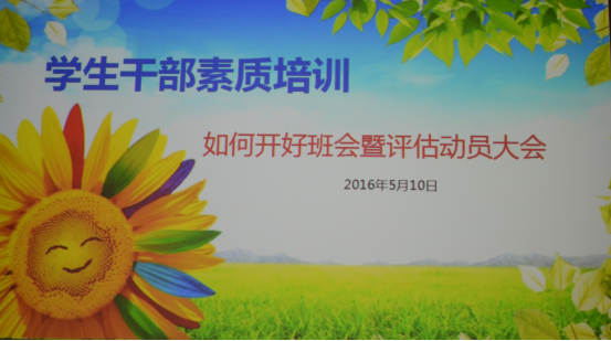 2016年5月13日中午12:30,太阳成集团tyc33455“学生干部素质培训---如何开好班会暨评估动员大会”在太阳成集团tyc33455多功能厅举行。参加此次培训会的是太阳成集团tyc33455院长车战斌,党委副书记王雪芳,学工办主任王冰,学工办老师安榜、闫亚萍、常星、刘合友以及13、14、15级班委、学生会干部代表、社联干部代表、宿管会干部代表。