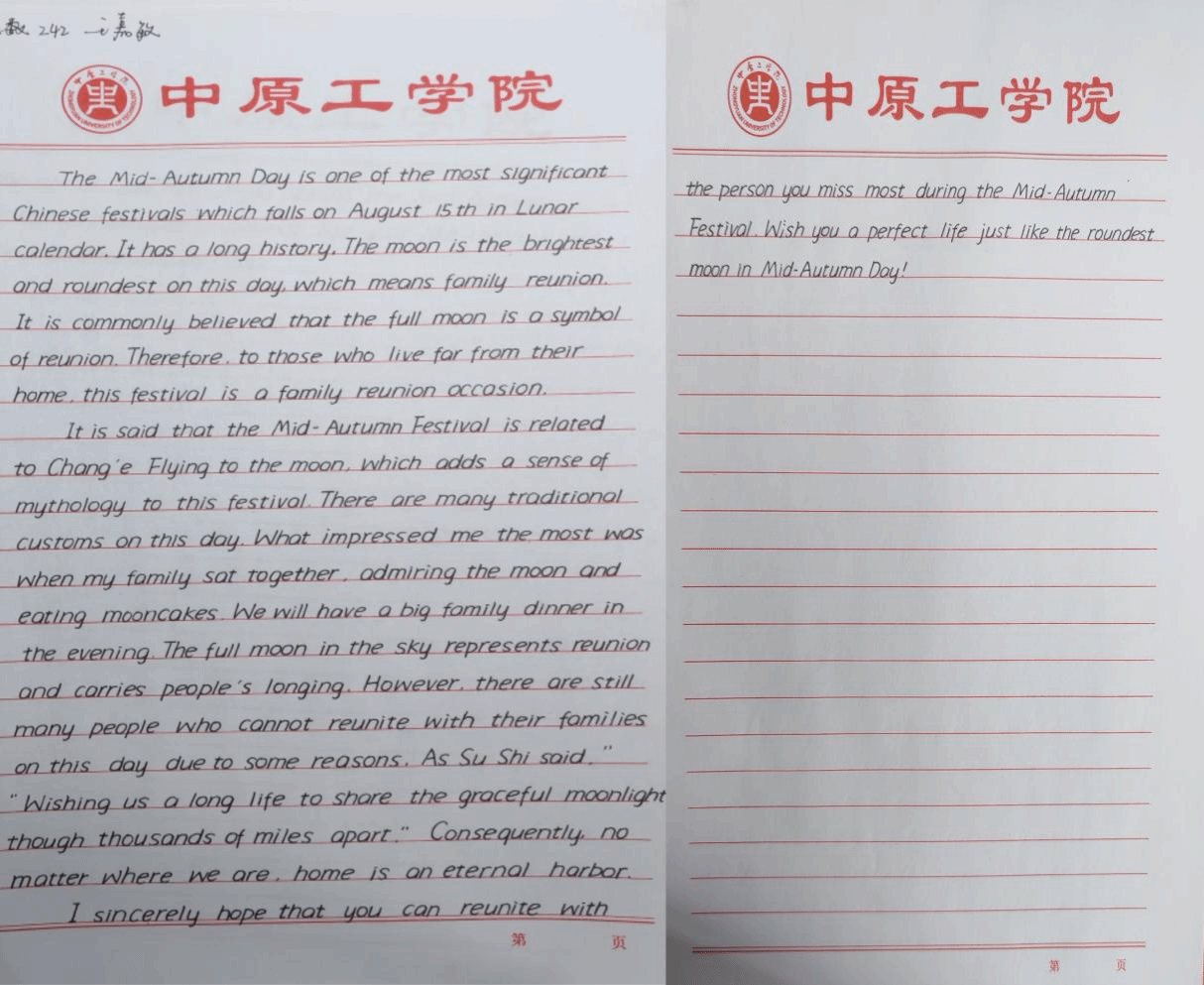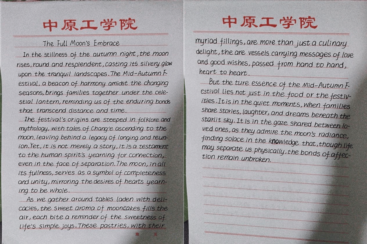 本次活动以“金秋月正圆,浓情溢九州”为主题,鼓励同学们以英文朗诵的形式,表达对中秋佳节的热爱与祝福。参赛者们围绕中秋节的主题,结合自己的感悟与体验,撰写充满情感与祝福的英文短文,参赛者们将自己的作文以朗诵的形式进行呈现。