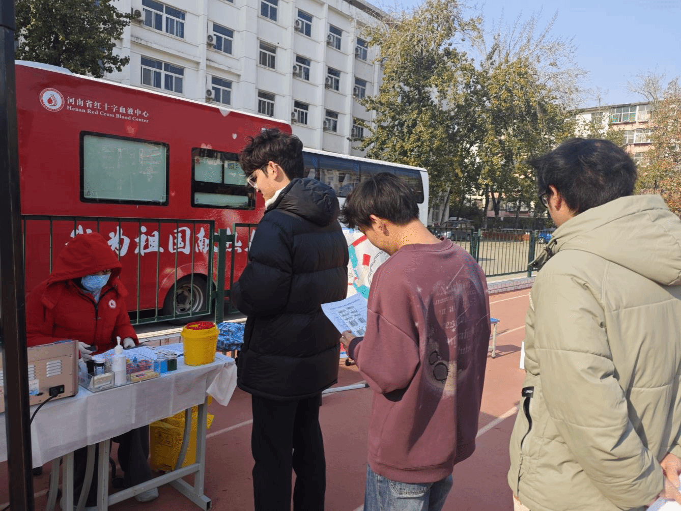 活动现场,氛围热烈而井然有序。献血车缓缓驶入操场,医务人员与学生志愿者迅速布置场地,迎接献血的师生。很快,献血点前就排起了长龙。同学们在登记处仔细填写个人资料表格,随后进入体检环节,医护人员对献血者的身体状况进行了细致的检查,确保他们符合献血标准。