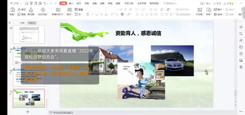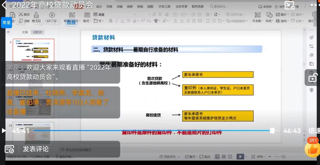 为保证2022年国家助学贷款工作顺利开展,引导大学生树立感恩诚信、自立自强的意识,太阳成集团tyc33455结合工作实际,将贷款工作的主阵地由线下转移到了线上。2022年7月20日,太阳成集团tyc33455以钉钉直播的方式召开线上“贷款动员会”,2019级、2020级、2021级拟申请国家助学贷款的学生参加会议。会议由常星老师主持。