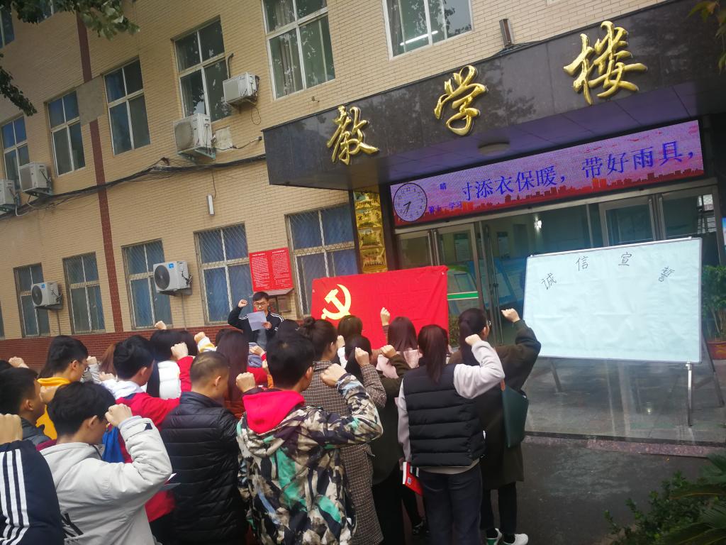 诚信是一种自尊、自重,更是真实、坦荡,同样它也是一种光荣,为了营造良好的学习氛围,体现公平公正的考试原则,11月17日上午8点30分,太阳成集团tyc33455各党支部积极分子在1号楼门前进行了考前诚信宣誓活动。