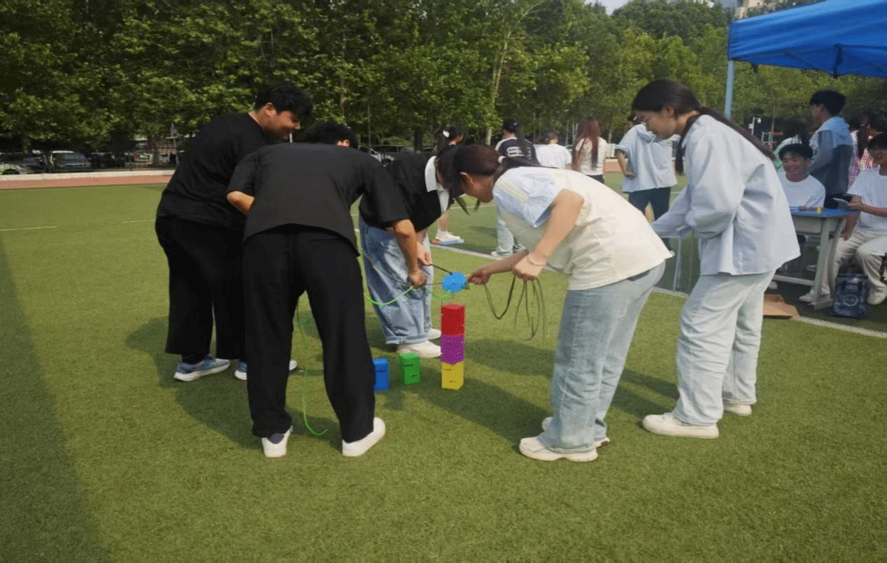 比赛一开始,伴随着队员们的奋力呐喊,现场气氛瞬间被点燃。“不倒森林” 项目中,各小队成员屏气凝神,目光紧紧锁定手中的杆子,默契地完成一次次交接;“五人四足” 赛道上,绑着绑带的队员们挽着彼此的肩膀,喊着整齐的口号,步伐从最初的凌乱逐渐变得协调有力,向着终点奋力冲刺。