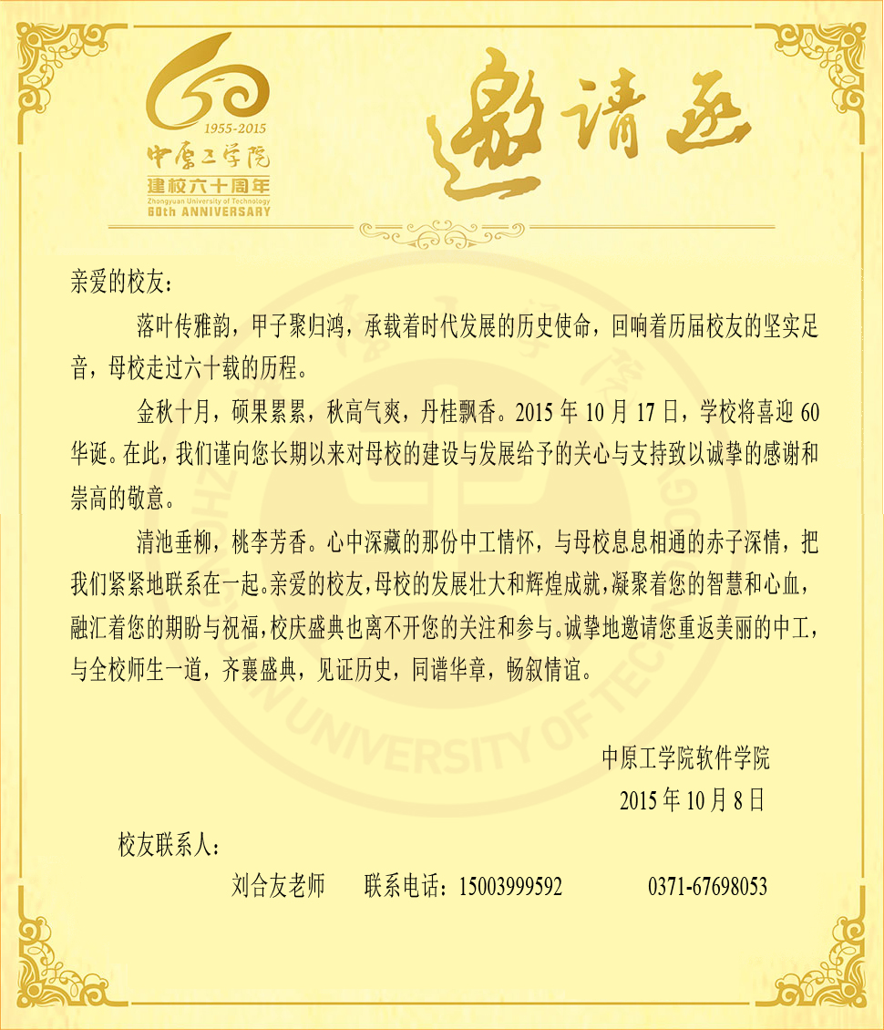 当前位置: 首页 >> 学院公告 >> 正文 建校六十周年邀请函 发布日期:2015-10-09 作者:学工办 点击: 上一条:关于太阳成集团tyc33455ccAndroid移动应用上线的通知 下一条:软件工程师讲座(之第六十三讲)通知