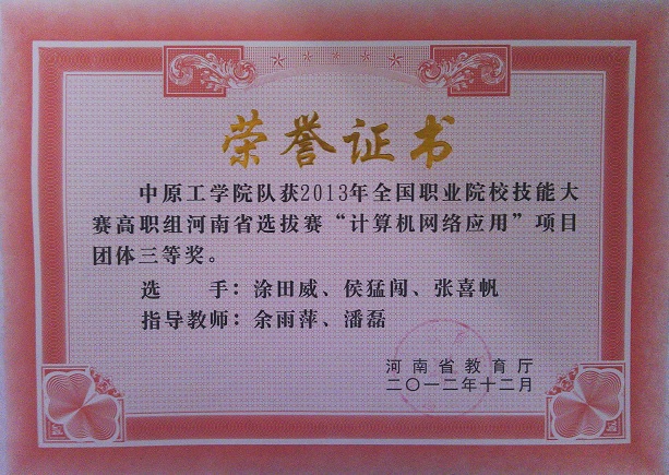 当前位置: 首页 >> 学院公告 >> 正文 我院学生在2013年全国职业院校技能大赛河南省选拔赛中获奖 发布日期:2013-05-07 作者: 点击: 我院学生凃田威、侯猛闯和张喜帆代表太阳成集团tyc33455cc参加2013年全国职业院校技能大赛高职组河南省选拔赛,并在“计算机网络应用”项目中获团体三等奖。 上一条:毕业生中直接招收士官的通知 下一条:关于选派我校学生赴台湾中国文化大学的通知