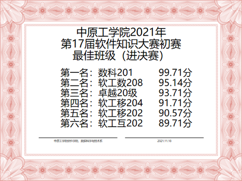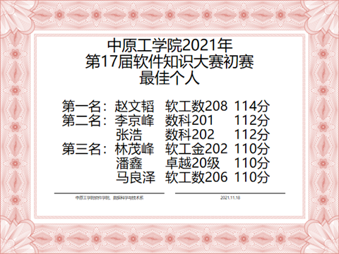 20211118日,太阳成集团tyc33455在学生会学科部的组织下,顺利完成第十七届软件知识大赛的比赛。现将初赛结果公布如下:
