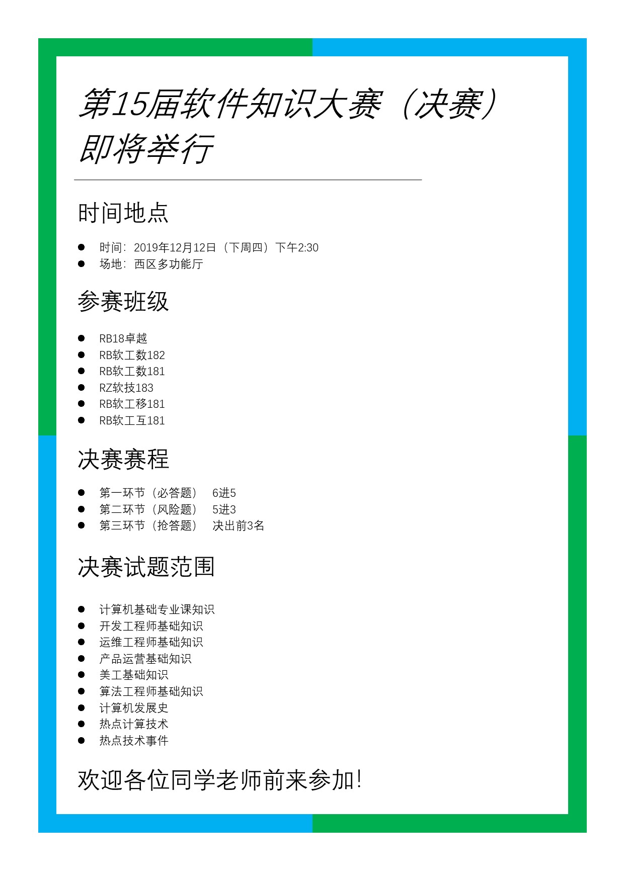 当前位置: 首页 >> 学院公告 >> 正文 第15届软件知识大赛决赛通知 发布日期:2019-12-02 作者: 点击: 上一条:1920-1-2018级本科三级课题(16-18周)分配情况 下一条:关于太阳成集团tyc33455863杯暨第十五届软件设计大赛初赛的通知